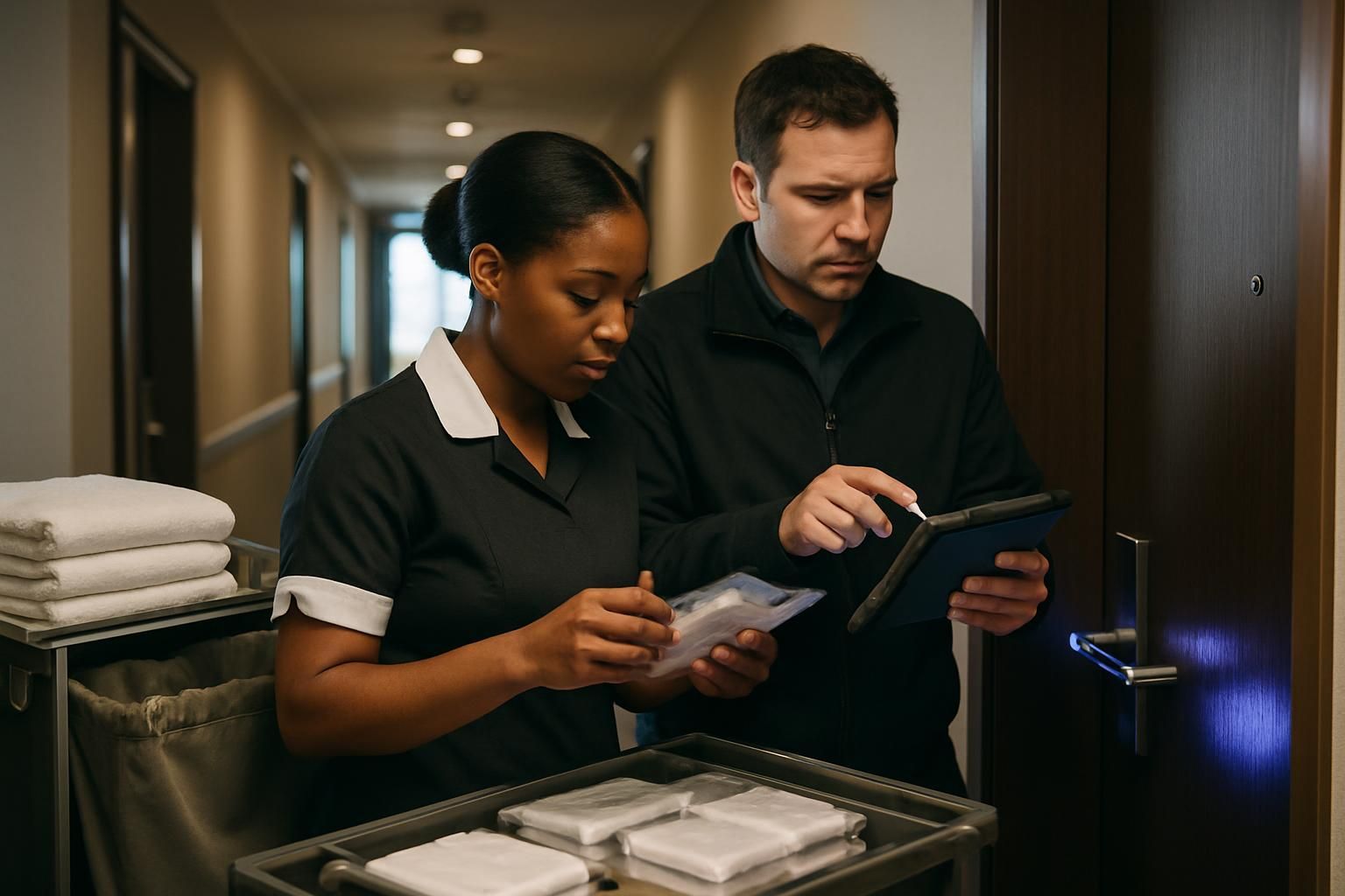 - In-process housekeeping checks (high-touch points, floors, washrooms, waste, spill response)